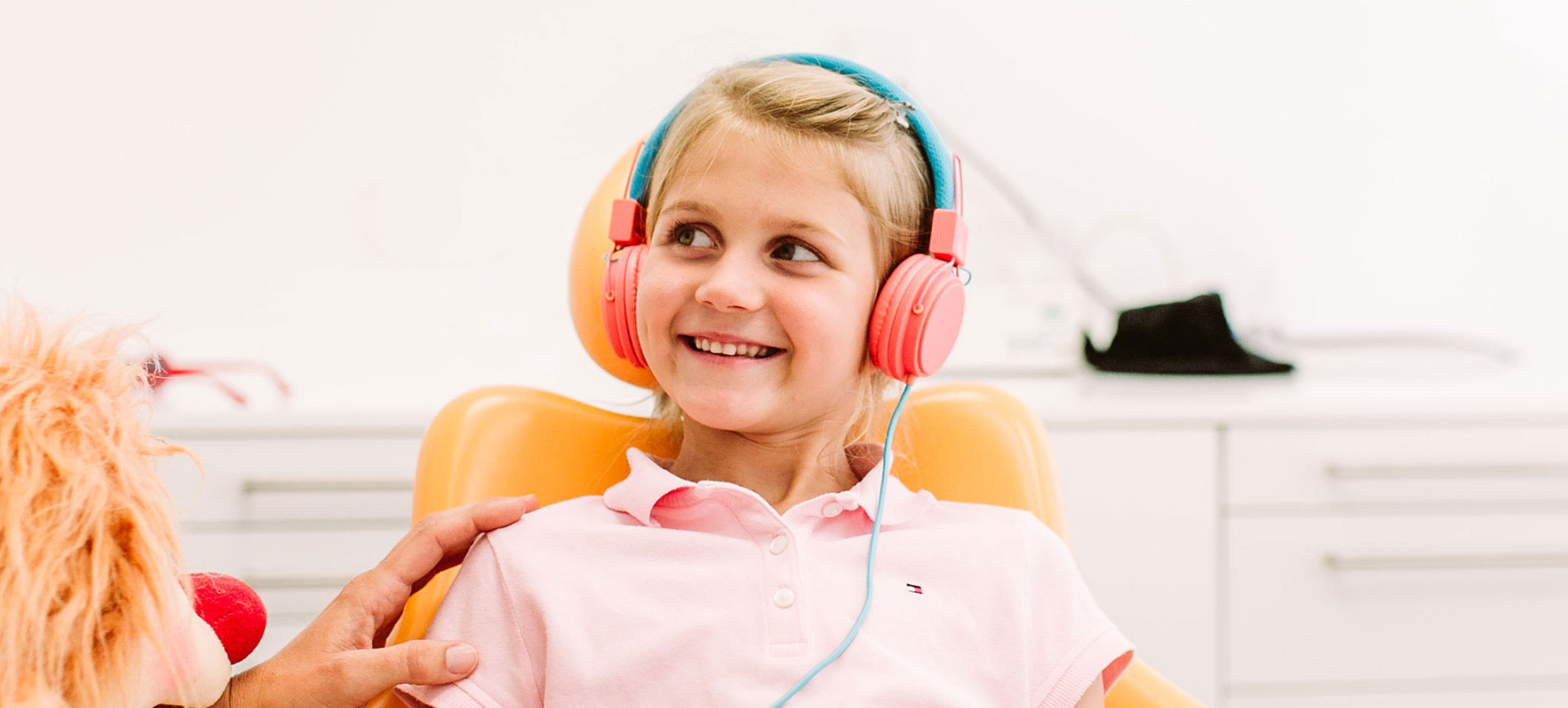 Wir kreieren also mit Umgang und Umgebung ein angstfreies Umfeld für die Kleinen, in dem sie sich wohl- und sicher fühlen können. Es hilft dabei, wenn sich das Kind in einer vertrauten Umgebung wiederfindet. Wir bieten Ihnen einen Kennenlern-Termin vor der ersten Untersuchung an, damit Ihr Kind uns und die Räume „beschnuppern“ kann.